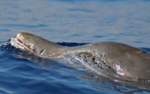 Blainville’s beaked whales are widespread in tropical and warm temperate waters worldwide. It’s one of the better studied species due to the fact that in some areas there are resident populations, such as in the Bahamas. Occurrences in higher latitudes are probably related to warm current systems, such as the Gulf Stream. Due to their unique head shape, jawline and distinctive teeth, when adult males are spotted it’s easy to recognise this species. Otherwise, at a distance, they can easily be confused with other mesoplodonts similar in size, shape and body colour.