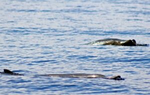 Like other members of the genus, they feed mostly on squid but may also take deep water fish. Blainville’s beaked whales occur in small groups of 3-7 individuals, usually one adult male accompanying a group of females and their calves. Subadults appear to stay in separate groups.